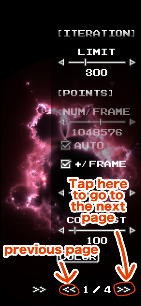When this setting is on, the number of points drawn per frame (NUM / FRAME) is automatically adjusted to prevent the iPhone’s rendering load from becoming too high.